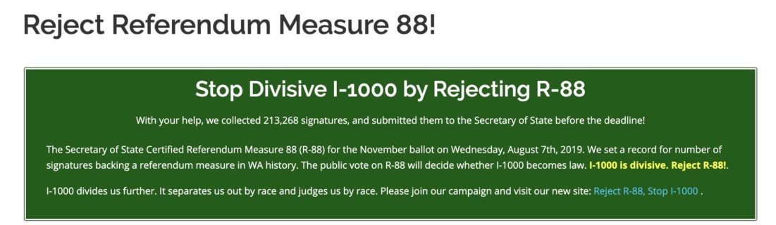 Community groups put together a Referendum (88) to Veto the reinstitution of what they consider “unfair affirmative action” laws and the repeal of the 1998 Initiative 200. The groups got enough signatures to get the Veto Referendum on the ballot on November 5th 2019.
