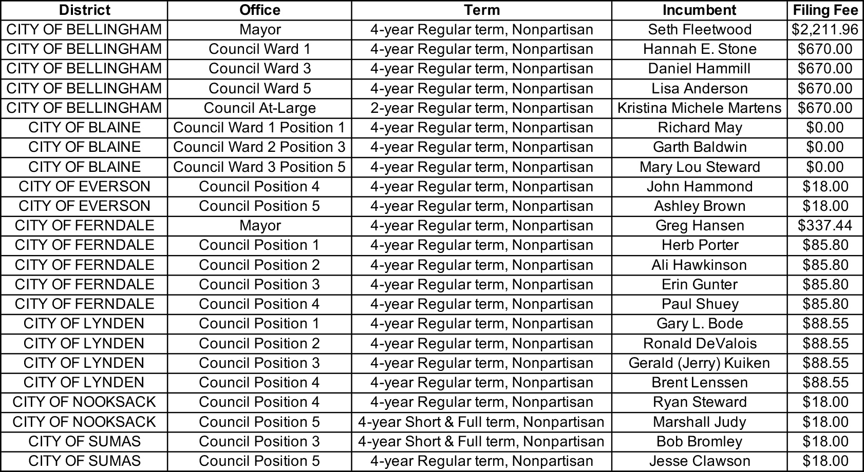 The following are the 21 positions on City Council and 2 Mayor Positions available in Whatcom County in 2023