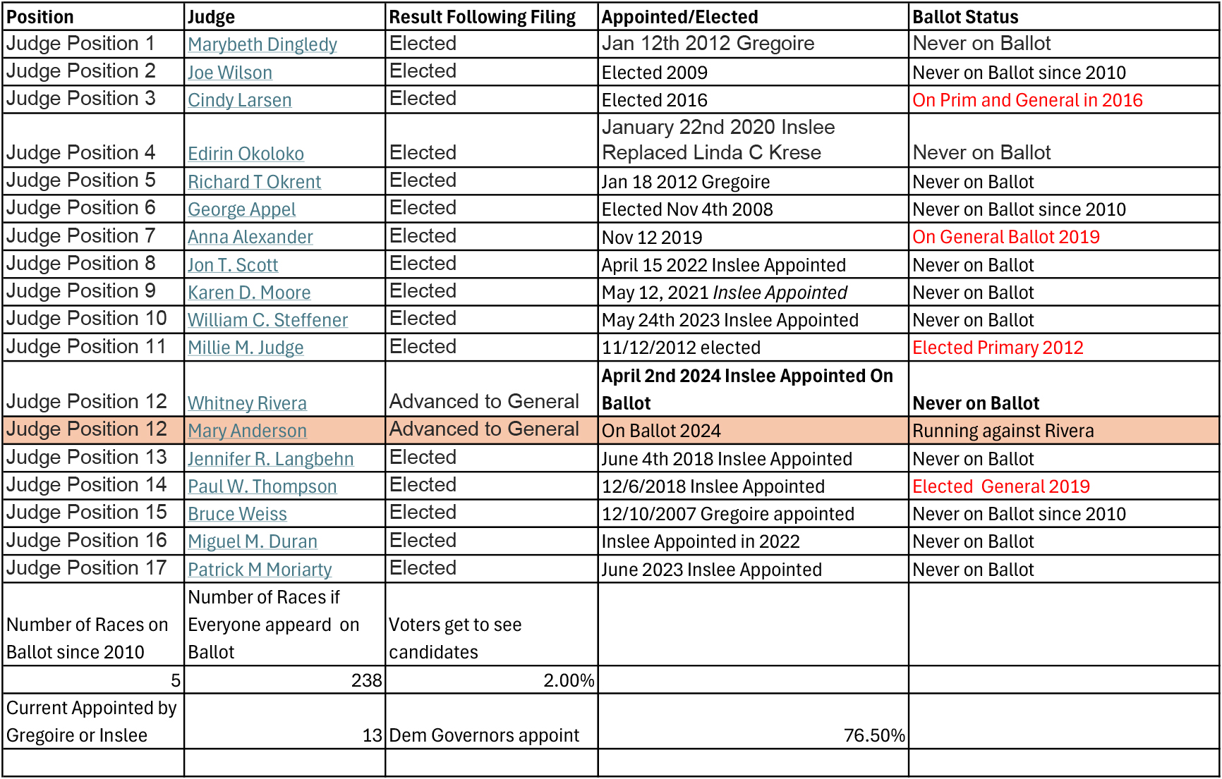 See the chart below to see who has Never been on the ballot in Snohomish County as a Superior Court Judge.