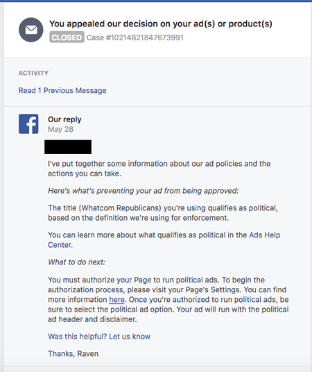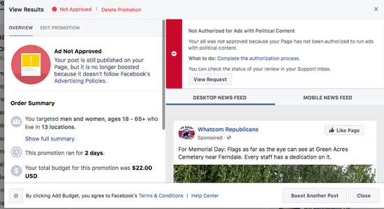 In order to show more people in Whatcom County the Memorial Day Flags of Greenacres on the party’s Facebook page Whatcom Republicans decided to “boost” the post which is a paid advertisement to reach more people on the Facebook Platform.