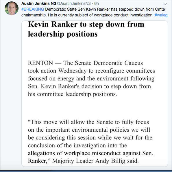 In today’s (January 9th 2019) developments Senator Ranker resigned from his assignment as chair of the Environment and Tourism committee forcing the Majority Democrats to reconfigure their organization of Committees concerning environmental issues at this late date.  The session begins Monday January 14th.