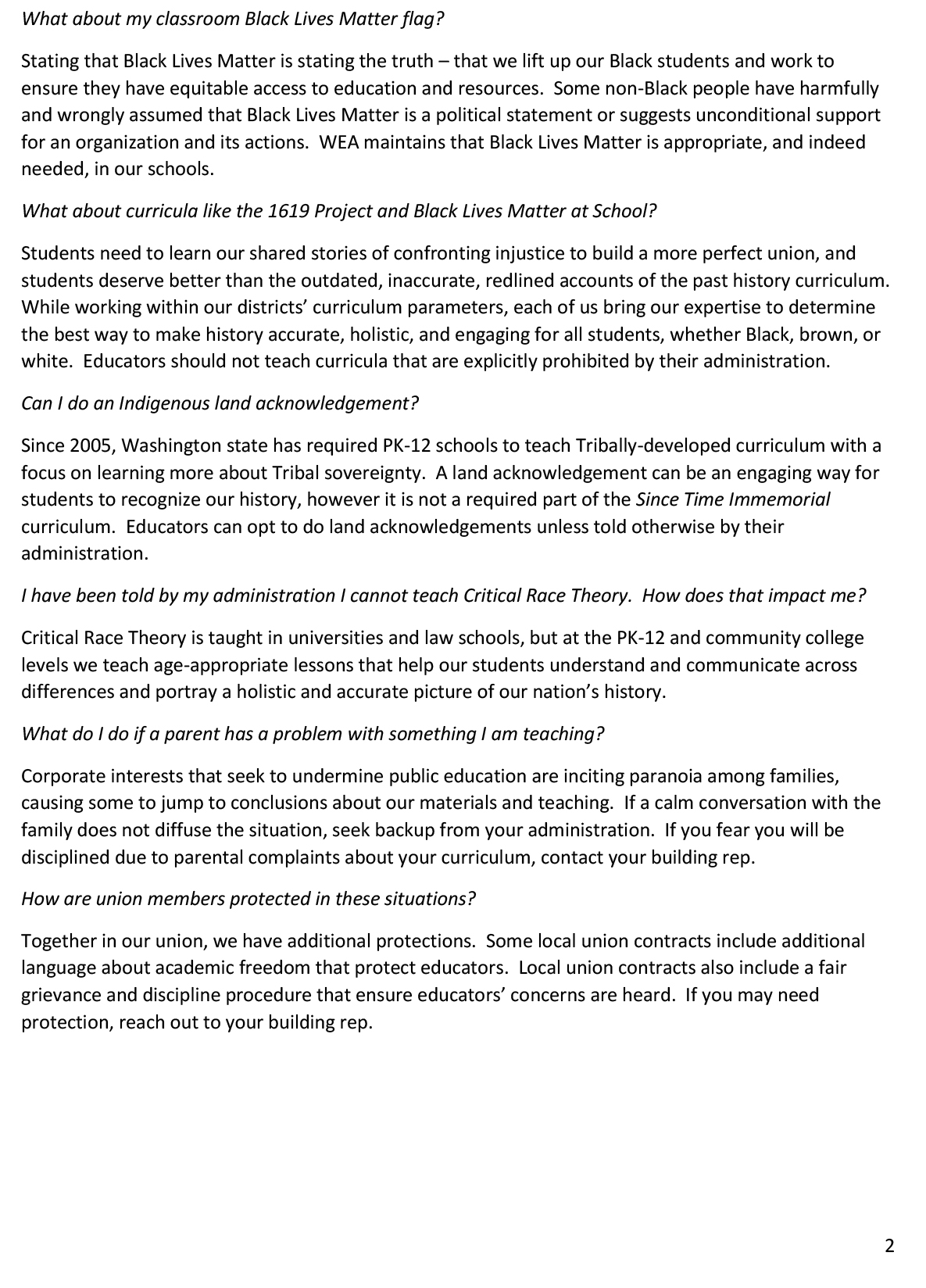 Stating that Black Lives Matter is stating the truth – that we lift up our Black students and work to ensure they have equitable access to education and resources. Some non-Black people have harmfully and wrongly assumed that Black Lives Matter is a political statement or suggests unconditional support for an organization and its actions. WEA maintains that Black Lives Matter is appropriate, and indeed needed, in our schools.